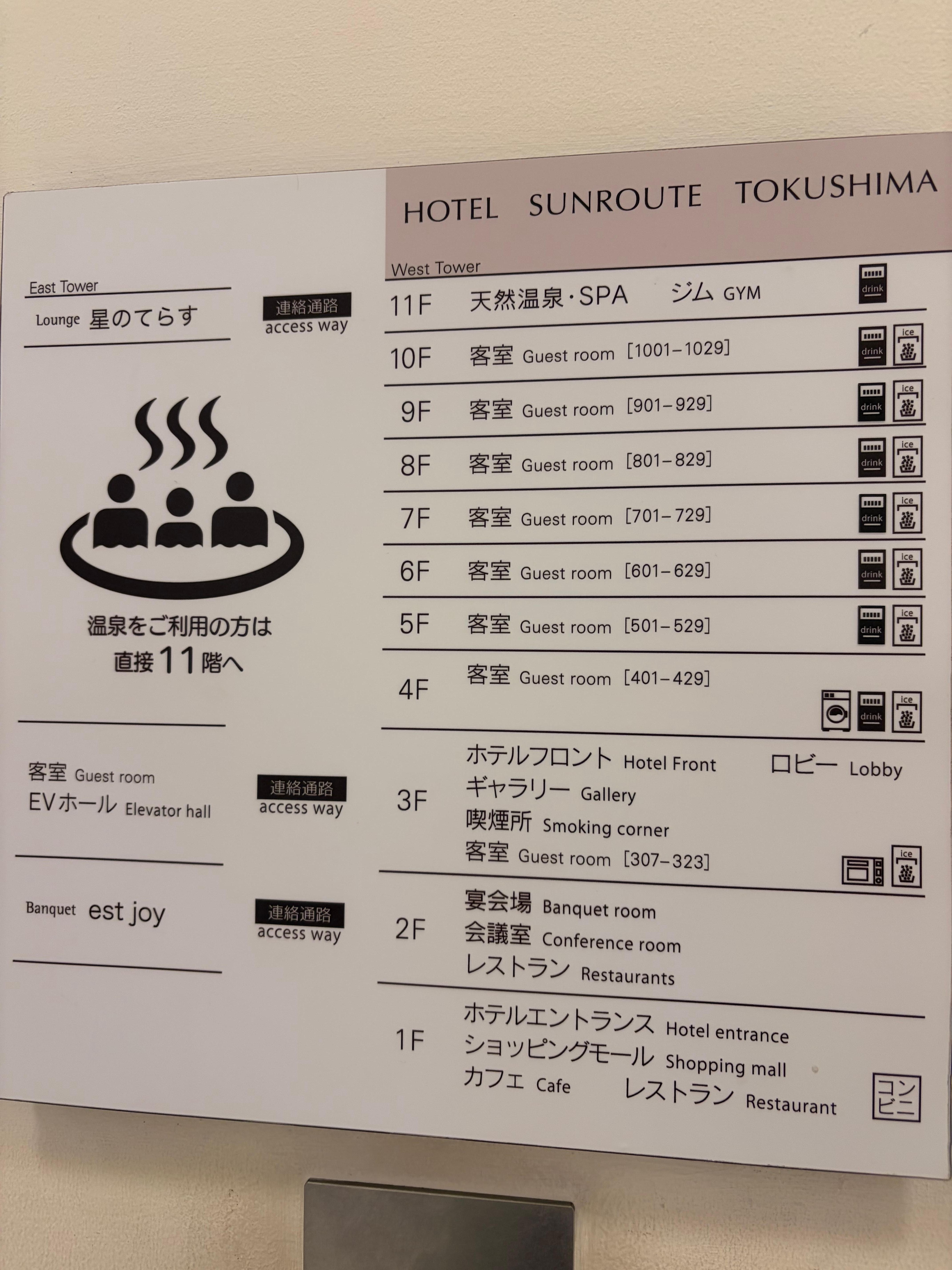 Public bath/onsen services include an indoor public bath (no minerals), an indoor mineral hot springs (Japanese-style onsen), and a yukata (Japanese robe). These services feature separate men and women areas. There are 2 hot springs open between 6:00 AM and midnight.