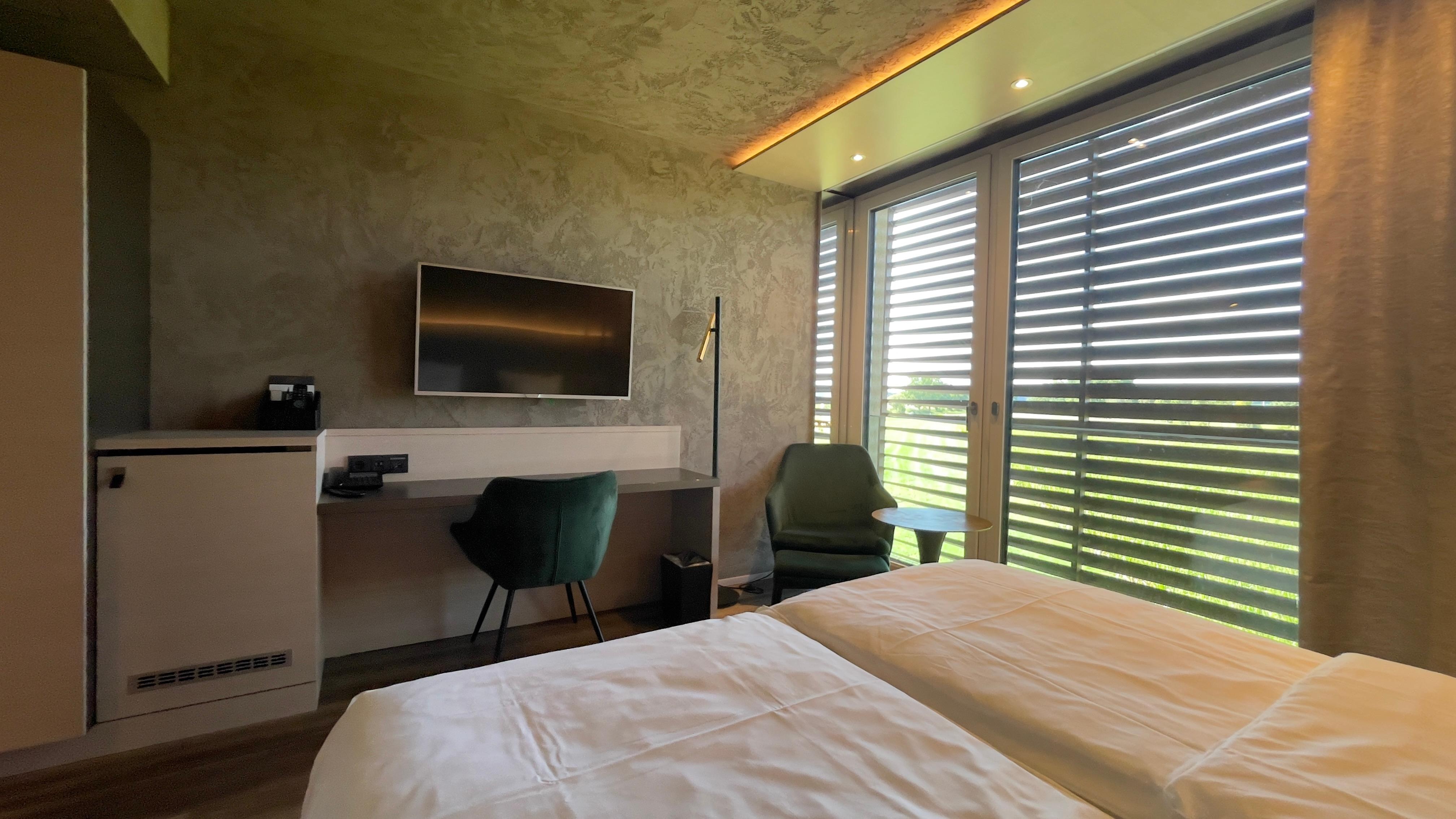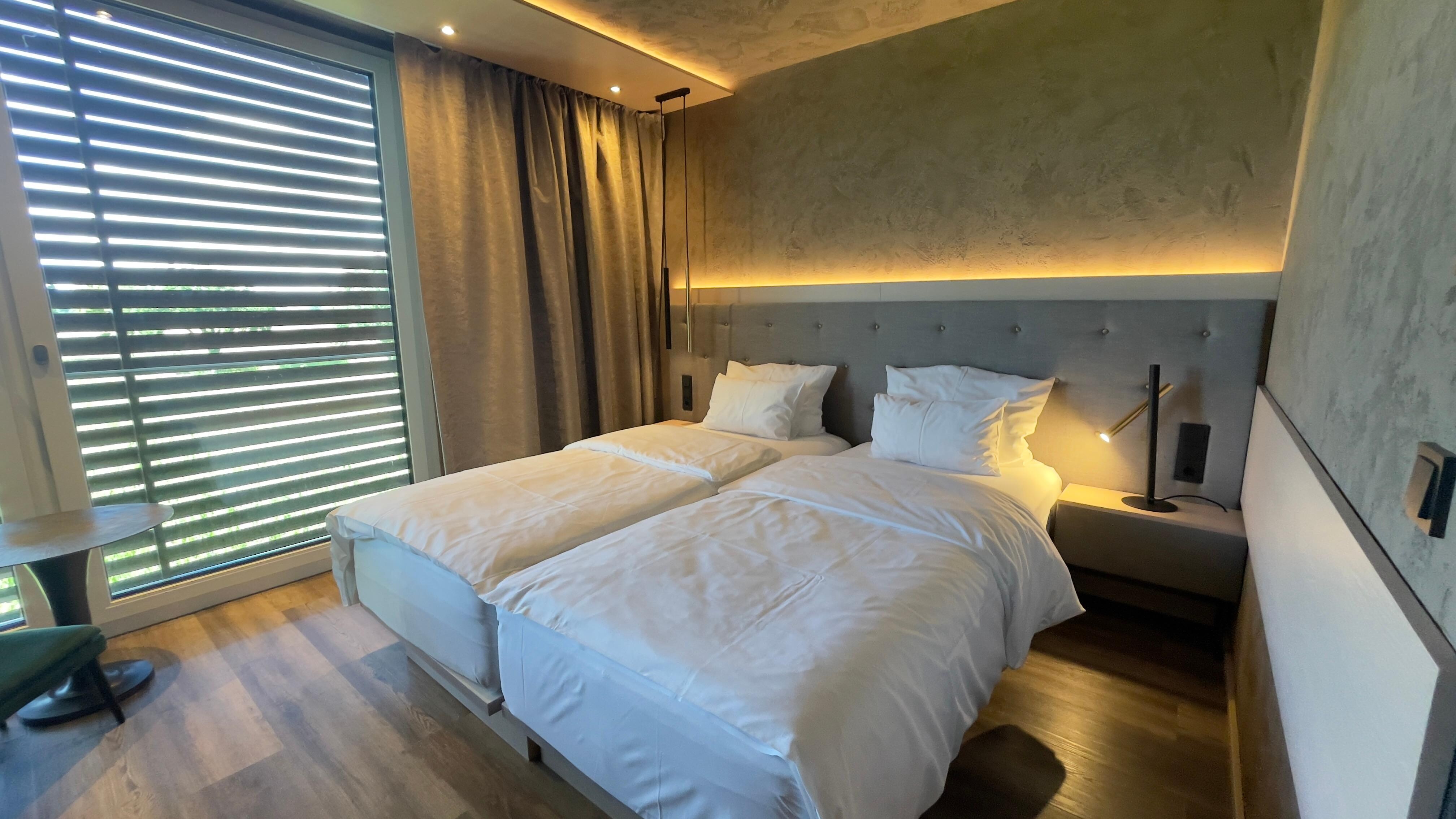 Das Hotel befindet sich etwas ausserhalb der Altstadt, aber man erreicht nach 10 Fußminuten die Altstadtmauer, insofern dennoch ein guter Ausgangspunkt, Dinkelsbühl zu erkunden. Das Hotel wirkt neu, die Zimmer sind großzügig, Kingsize-Bett, 2 Sitzplätze, Arbeitsfläche, Schrankplatz, Ablagen und ein fulminamtes Bad auch im Standardzimmer. Das Personal ist sehr freundlich und hilfsbereit. Der Aussensitzbereich ist toll, mit Stegen in eine Wasserlandschaft. Das Hotel verfügt über ein grosses optisch gelungenes Parkhaus, das abends als LED-Projektionsfläche genutzt wird. Die Bar ist gross, morgens auch Frühstücksraum, 4 Seiten Gin-Karte, Nüsschen zum Drink, nichts Besonderes, aber nett. Das Hotel nennt sich Design-Hotel, die goldenen Boxer vor dem Eingang werden mir in Erinnerung bleiben. Der Eingangsbereich ist eher kitschig, der Rest des Hotel ganz angenehm mit unterschiedlichen Farbkonzepten auf den Stockwerken. Meiser arbeitet intensiv an der Aufwertung des Ortes, sehr erfolgreich, wie ich meine. Aktuell bedeutet das, das sich um das Haus herum Baustelle befindet.